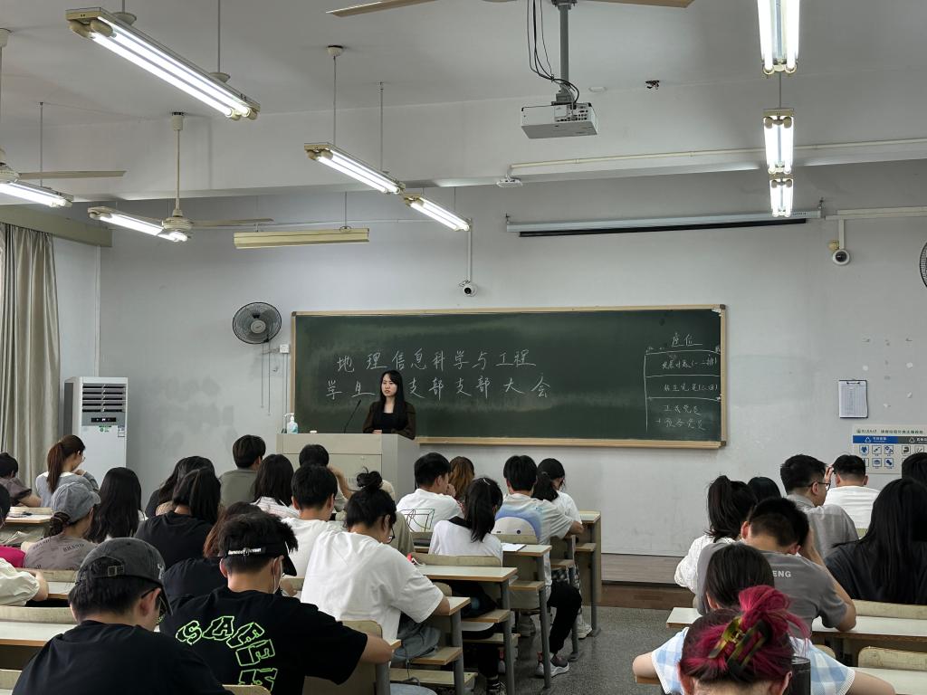 地理信息科学与工程学生党支部于教1-509开展支部大会。大会共分为五个流程:新发展对象发言,新转正党员发言,考察人对发展对象进行批评指正,新发展对象宣誓,支部书记总结。